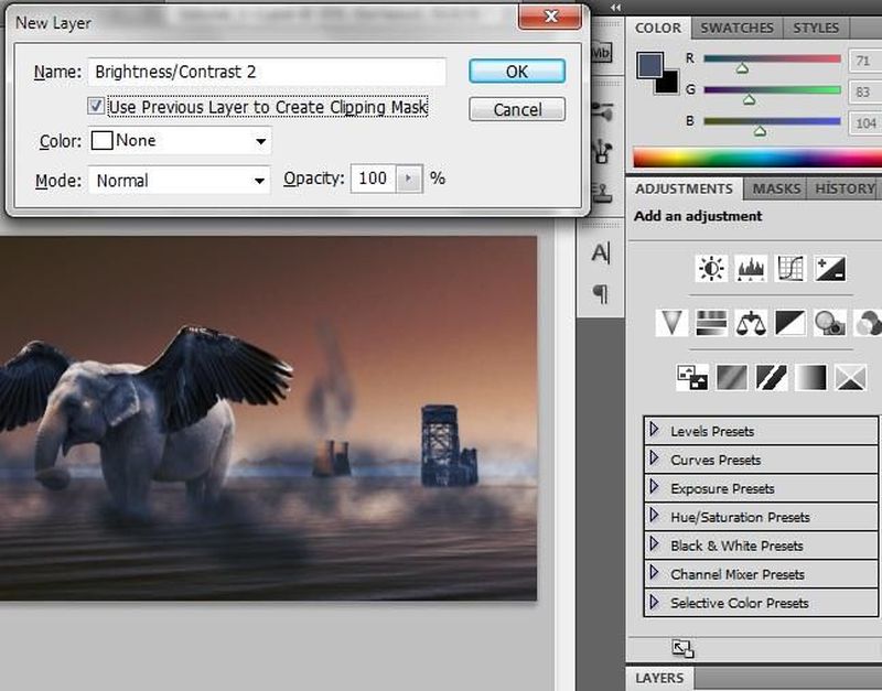 Son olarak ise bazı katmanların parlaklıklarını ve kontrast ayarlarını değiştirelim. İki kanat katmanı için kendilerine ait ayarlama katmanı oluşturabilmek için, örneğin sağ kanat katmanı için; bu katman seçili iken tuşuna basılı tutarak ayarlama katmanı oluştur ikonunun üzerine gelip oradan da Brightness/Contrast ek ayarlama katmanını oluştur deyin. Ardından oluşan katman veya ayarlama penceresinden parlaklık ve kontrast ayarını yapabilirsiniz.