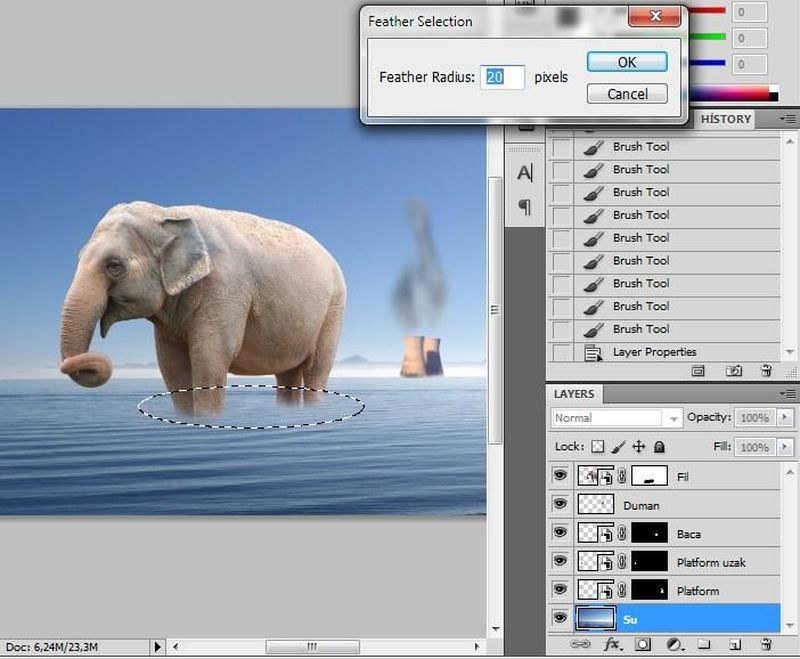 Ayakları da maske ile biraz sildikten sonra, suyun olduğu katmanda iken, Eliptik Marquee Aracı' yla filin ayaklarının suya girdiği yerlerin etrafında bir dalgalanma yaratmak için, ayaklarını çevreleyecek şekilde, farenin sol tuşuna basılı tutarak bir alan seçelim. Bu alanı beliren çizgilerin üzerine gelip farenin sol tuşuna basılı tutarak istediğiniz daha uygun bir konuma taşıyabiliriz. Seçili yerin kenarlarını yumuşatmak için önceden de kullandığımız gibi Feather özelliğinden yararlanalım. Bunun için Select > Modify > Feather sekmelerine tıklıyor ve yumuşatma genişliğini belirleyen açı değerini 20 derece olarak girebiliriz.