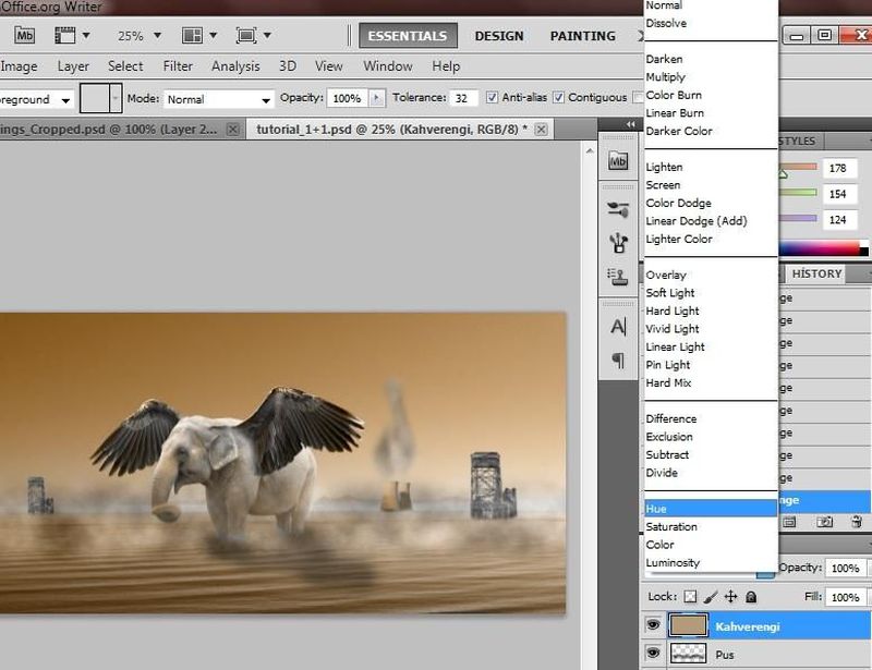 Adım 8 : Şimdi ise en eğlenceli kısma geldik: renk karıştırma. Resmimizi, ona ekleyeceğimiz ve yaratacağımız renklerle her şeyin bir bütün olduğu hissini yaratan en çekici şekle getirme vakti geldi. Başlangıç olarak en üste yeni bir katman oluşturalım ve ismini “kahverengi” koyalım; çünkü ilk olarak bu renkle başlayacağız. Şimdi rengimizi seçebilmek için araç penceresindeki ön plan renginin üzerine tıklayarak # işareti ile belirtilen kutucuğa “b29a7c” yazdığınızda bu seçmek istediğimiz rengin hexadecimal olarak karşılığına denk gelir. Ardından Paint Bucket Tool aracılığıyla, bu rengi tüm tuvalimize boya kovasıyla boşaltıyoruz. :) Ardından da katmanımızın karıştırma modunu(Blending Mode) Color veya Hue olarak seçiyoruz.