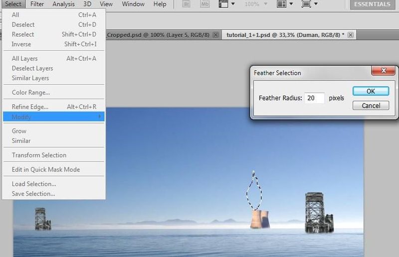 Adım 4 : Yaratacağımız duman efekti için öncelikle yeni bir katman yaratıp, kement aracını seçtikten sonra oluşturduğumuz katmanlardan biri olan baca figürünün üzerinde duman olmasını istediğimiz alanı seçelim. Ardından da Selecect > Modify > Feather sekmelerine tıklayarak, seçtiğimiz duman alanın kenarlarını verdiğimiz yarıçap miktarı genişliğinde yumuşamış kenarlara dönüştürürüz.