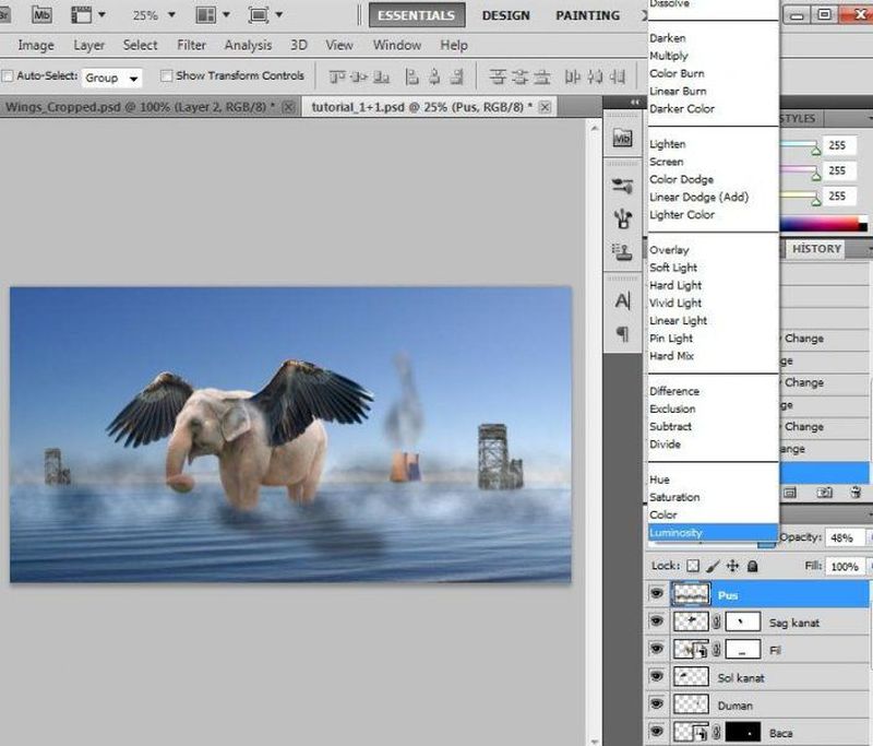 Sadece sağ kanatla çalışmaya başlayalım. Eğer sol kanadın olduğu katmanı görmek istemiyorsanız, şimdilik katman penceresinde, sol kanadın olduğu katmanın sol tarafındaki göz resmi olan küçük pencereye tıklamanız yeterli. Şimdi sağ kanat katmanına geri gönüp, Move Tool ile istediğimiz konuma hareket ettirip, bu katmanı Smart Object'e çevirerek maske uygulayabiliriz önceki adımlardaki gibi. Add Layer Mask dedikten sonra boyama fırçasıyla birlikte, fırçanın yumuşaklığını ve boyutunu ayarlayarak, kanadın gövdeyle birleştiği noktaları biraz da yumuşak ve az belirgin yapabiliriz.(bir nev-i silme işlemi) . Sağ kanat için maskeleme işlemini bitirdiğimizde, sol kanadı da hareket aracıyla uygun posizyona getirdikten sonra şimdi kanatların su üzerindeki gölgelerine geçelim. Suyun üzerinde “gölge” adında yeni bir katman oluşturarak işe başlayabiliriz. Bunun için yumuşak bir boyama fırçası seçip, boyutunu ayarladıktan sonra ön plan rengi siyah iken gölge olması ihtimal yerleri boyamakla başlıyoruz. Eğer çok taşırdığınızı düşünürseniz Erase Tool ile silebilirsiniz. Ardından katmanın opaklığını katmanlar penceresinden azaltıp, gölge havasını daha etkili bir şekilde verebilirsiniz.