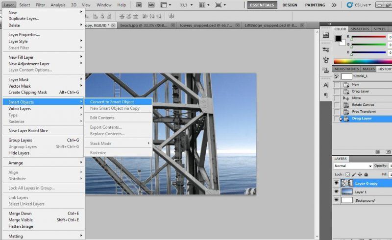 Adım 2 : Fon olarak kullanacağımız resmi ekledikten sonra, figürleri koymaya ve efektleri eklemeye başlayabiliriz. Öncelikle duman efektini kullanacağımız, platform görünümlü, tuvalimize eklenmesi kolay olsun diye önceden kırpılmış olan yapıyı Photoshop'ta açtıktan sonra bir önceki resim gibi taşıma metodu ile tuvalimize bir başka katman olarak ekleyelim. Ardından, tüm resim üzerinde yapılabilecek değişikliklerin bu katmanı etkilememesi veya tekrar tekrar ölçeklendirirken kalite kaybı olmaması için bu katmanı Smart Object olarak belirlememiz gerek. Bunu da Layer > Smart Object > Convert Smart Object seçeneklerinden uygulayabiliriz.
