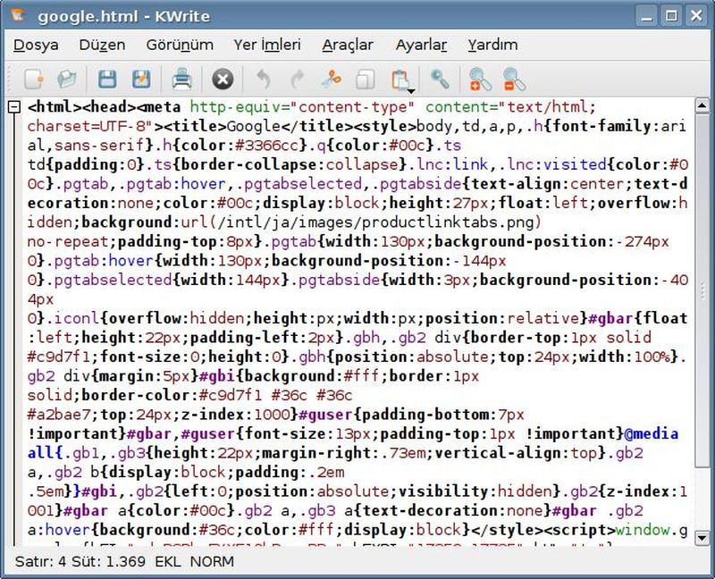 Şimdi, KWrite'ta düzenli ifadeleri kullanarak nasıl arama yapıldığını bir örnek üzerinde görelim. Yukardaki resimlerde gösterildiği gibi, önce örnek metin olarak Google'ın HTML kodunu açıyoruz. Amacımız, burdaki tüm linkleri düzenli ifadeleri kullanarak bulmak. Ctrl+F tuşlarını kullanarak, ya da menüden Düzen -> Bul (Edit -> Find) seçeneğini seçerek, düzenleme penceresini açıyoruz. Bir düzenli ifade aratmak istediğimizi belirtmek için, çıkan penceredeki Düzenli ifade (Regular expression) seçeneğini işaretliyoruz. Daha sonra arama kutusuna, <a href="adres" ..> şeklindeki yapıları bulmak için <a href=[^>]*> ifadesini girip, Bul (Find) tuşuna bastığımızda, bize ilk eşleşen ifadeyi seçilmiş bir şekilde gösteriyor. Bundan sonra, menüden Düzen -> Sonrakini Bulu (Edit -> Find Next) seçerek ya da F3 tuşuna basarak bu türdeki tüm ifadeleri görebiliyoruz.