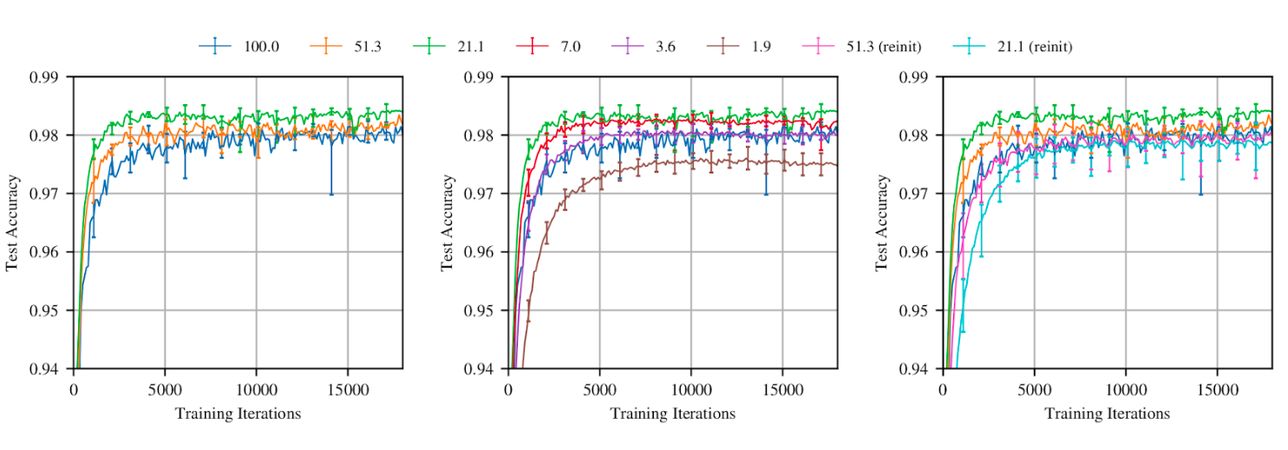 Yapılan bu teste görüldüğü gibi programın eğitim sürecinde , başlangıçta olan parametrelerin sadece yaklaşık %21 kullanılarak hiç pruning yapılmamış haline yakın hatta daha yüksek bir test başarı yüzdesi elde ediliyor (Yeşil ve mavi çizgiler).[5]