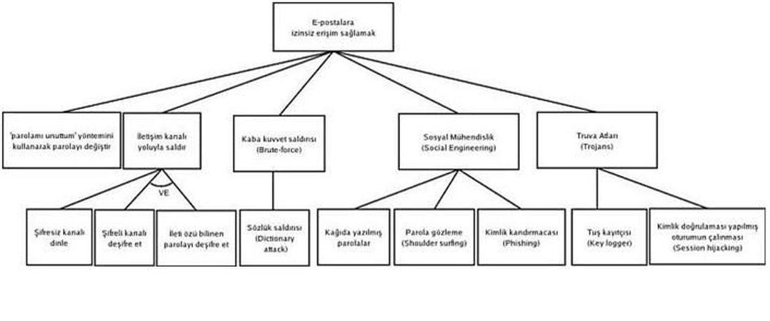 Bir örnekle bahsettiğimiz işlemleri daha somut bir hale getirecek olursak e-posta sistemi için bir saldırı ağacı oluşturalım. Bir saldırganın belirlediği belli bir kişinin e-postalarına izinsiz erişmesini ana hedef olarak seçelim ve saldırganın bu ana hedefe ulaşabilmesi için uygulayabileceği yöntemleri saldırı ağacı ile gösterelim. Şekilde de gösterildiği gibi saldırı ağacının en tepesine saldırganın ana hedefi olan e-postalara izinsiz erişim yerleştirilir. Diğer alt dallar ise bu hedefe ulaşabilmek için yapılabilecek yöntemleri(tehditleri) göstermektedir. Saldırgan, e-postalara izinsiz erişim sağlayabilmek için başlıca beş yöntem deneyebilir.
