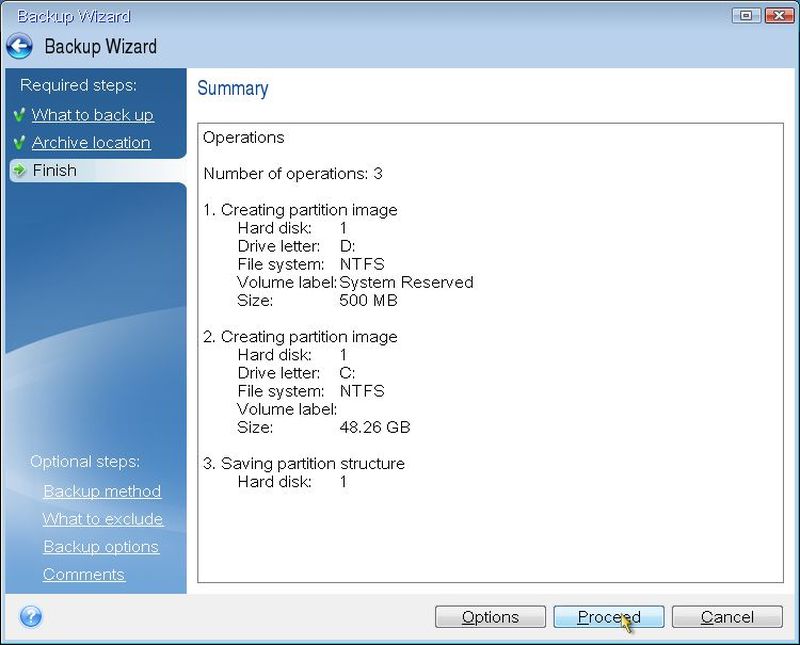 Şekil 2.11. Yapılan ayarlar kullanıcıya özet olarak sunulmaktadır. Proceed (Türkçe. İlerle) butonu tıklanacak olursa program yedek alma işlemine başlayacaktır.