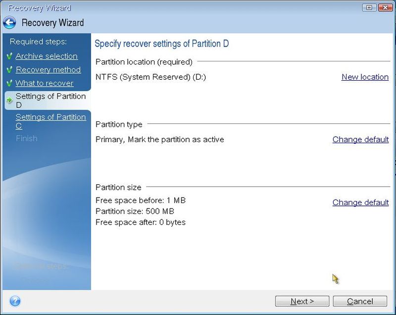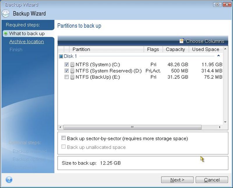 Yedekleme işleminin, sabit disk üzerinde sistemin kurulu olduğu dizin haricindeki sürücüye alınması, alınan verilerin güvenliği açısından tavsiye edilmez. Ayrıca sistem yedeği, sistemin bulunduğu sürücü ile aynı dizin altında bulunan herhangi bir dosya üzerine gerçekleştirilemez. Ekranda görünen C ve D sürücüleri tek bir sabit disk üzerindedir ve E sürücüsü sistemden ayrı bir sabit disk üzerinde tanımlanmıştır.