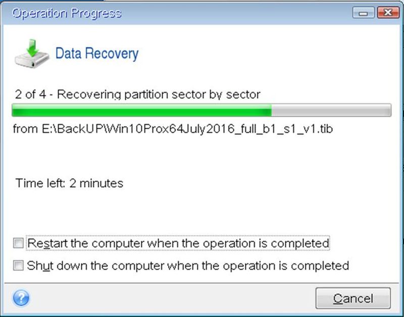 Şekil 2. 20. Restart the computer when the operation is completed (Türkçe. İşlem tamamlandığında bilgisayarı yeniden başlat) ve Shut down the computer when the operation is completed (Türkçe. İşlem tamamlandığında bilgisayarı kapat) seçenekleri tıklanırsa ilgili işlem gerçekleştirilebilir. Programın işlemleri tamamlamasının ardından, bilgisayar yedek dosyasının alındığı andaki dosya, ayar ve programlara kavuşacak; diğer bir ifade ile yedek alındıktan sonra sabit disk üzerinde gerçekleştirilen dosya yükleme, program kurma ya da ayar değiştirme gibi tüm işlemler sıfırlanacaktır.