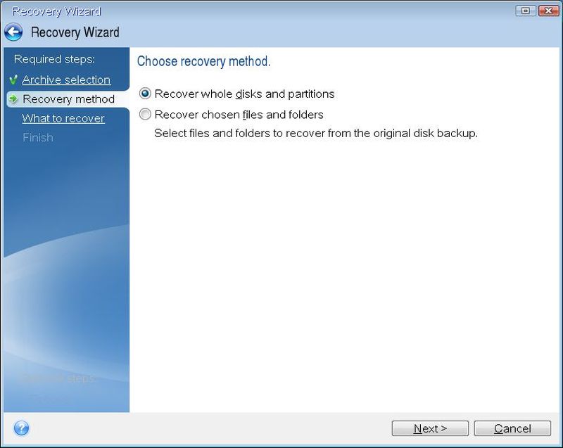 Şekil 2. 16. Choose recovery method (Türkçe. Kurtarma yöntemini seç) ekranında, Recover whole disks and partitions (Türkçe. Bütün diskleri ve bölümleri kurtar) ve Recover chosen files and folders (Türkçe. Seçilen dosya ve klasörleri kurtar) seçenekleri bulunmaktadır. Alınan tam yedek dosyasından sadece belli dosya ve klasörlerin tekrar yüklenmesi sağlanabileceği gibi tüm sistemin kurtarılması işlemi de gerçekleştirilebilir.