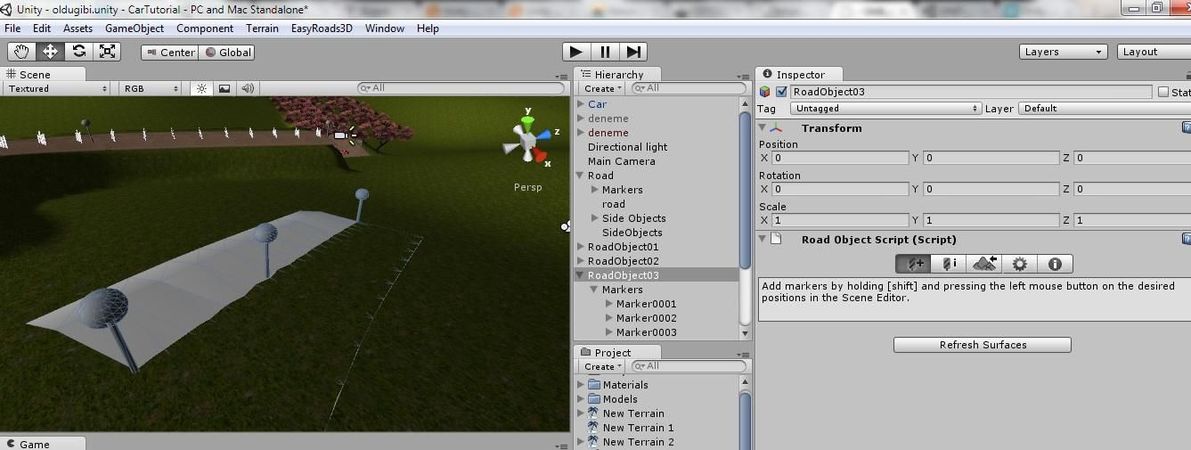 Pre-order fiyatı $39 olan bu paketi, bu bedeli ödeyerek satın alıp ya da ücretsiz olan demo sürümünü indirip “Assets->Import Package” seçenekleriyle de projenize ekledikten sonra “EasyRoads3D” ismindeki ek bir sekme Unity menü çubuğuna eklenecektir. Arazi->Arazi Yarat (Terrain->Create Terrain) yoluyla arazinizi yarattıktan ve yukarıda bahsettiğim adımlardan birini takip ederek biraz yükselti katıp şekillendirdikten sonra ek olarak gelen bu yeni sekmeye tıklayıp Yeni Nesne (New Object) diyerek size yol, nehir veya çit, duvar gibi başka bir nesne (custom object) seçeneklerinden hangisini oluşturmak istediğinizi soruyor. Yolu seçtiyseniz adını belirlediğiniz yeni nesne hiyerarşi sekmesine ekleniyor ve sizden yolu oluşturmaya yarayan işaretleyici (marker) olarak adlandırılan nesneleri araziye arka arkaya eklemenizi bekliyor. Artık geri kalan işlemleri Kontrol (Inspector) sekmesinde çıkan EasyRoads3D’nin kendi editörü üzerinden yapmaya devam ediyorsunuz. Eklediğiniz iki işaretleyici arasına bir yol parçası kendiliğinden ekleniyor. Bu şekilde yol işaretlerini arazinizin üzerinde istediğiniz yöne doğru adım adım koyabilirsiniz. İşaretleri koyduktan sonra “Araziyi İşle, Yol Geometrisi Yarat” (Process the terrain, creat road geometry) düğmesine tıkladığınızda yolunuz belirlenen doku(texture) ile görünecektir. Diğer bir güzel özellik de bu işaretleyicileri hiyerarşi sekmesinden tek bir nesneymiş gibi birer birer seçerek Taşı(Move) aracı ile istediğiniz yüksekliğe çekebilmek ve her yöne kaydırabilmek. Bu işlemleri yaparken yol hiçbir zaman arazinizden bağını koparmıyor; yani eğer bir işaretleyiciyi yukarı doğru hareket ettirirseniz yolun altı da yükseliyor ve boşluk oluşmadan bütünlük sağlanıyor. Ancak, demo sürümünde en fazla 6 tane işaretleyici kullanmaya izin veriliyor.