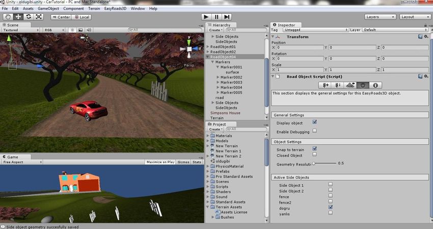 Yan Nesne(Side Object) adı verilen, yol boyunca yolun kenarlarına nesne koymanızı sağlayan bu seçenek de yeni tanımlayacağınız (model ve yerleşme aralıkları) kenar nesnesini yol boyunca yerleştiriyor. Bunun için yanlarında nesne yaratacağınız yol nesnesini önce seçmeniz, ardından da EasyRoads3D’nin editöründen Genel Ayarlar (General Settings) düğmesine tıklayıp, yarattığınız yan nesneleri etkinleştirmeniz gerekiyor. Bundan sonra bir soldaki “Araziyi İşle, Yol Geometrisi Yarat” (Process the terrain, creat road geometry) düğmesinde “Yan Nesneler İnşa Et” (Build Side Objects) dediğinizde bu yol için etkinleştirilmiş olan yan nesneler yolun kenarlarına eklenmiş oluyor.