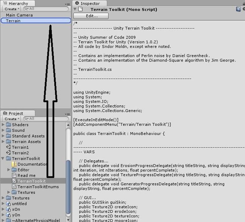 Bu linkten aracı indirdikten sonra Unity içinde “Assets->Import Package” yolundan indirdiğiniz Arazi Araç Takımı paketini seçtiğinizde bu paketin açılıp, içindeki klasörleri Proje(Project) sekmenize eklendiğini göreceksiniz. Aracın editörünü aktifleştirebilmek için projenize eklenen Arazi Araç Takımı(“Terrain Toolkit”) klasörünün içindeki “Terrain Toolkit” betiğini Hiyerarşi sekmenizdeki arazi nesnenizin üzerine sürüklemelisiniz.