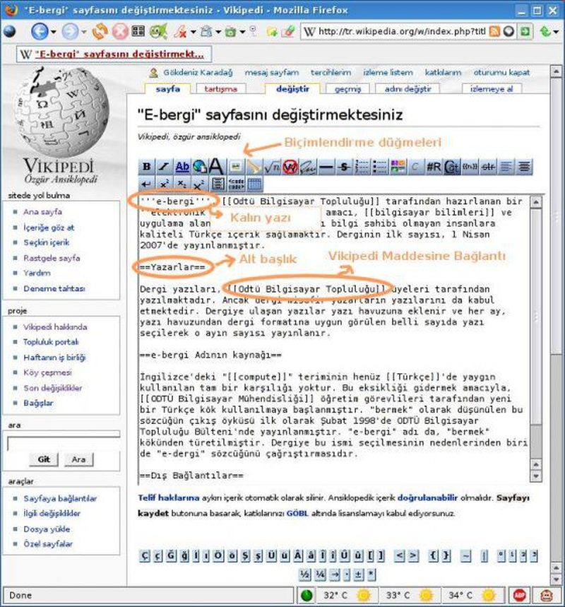 Özel biçimlendirme işaretlerini öğrenin: Vikipedi maddelerini biçimlendirmek için sayfa kaynağında özel bazı karakterler kullanılır. Örneğin kalın olmasını istediğiniz kısmı üçer adet kesme işaretiyle çevrelemeniz gerekir;