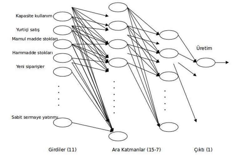 Örnek olarak yapılan bir uygulamada; üretim durumunun tahmini için, girdi olarak kapasite kullanım oranı, yurtiçi satış miktarı, mamul madde stokları, hammadde stokları, yeni siparişler, satış fiyatları, hammadde fiyatları, hammadde ve aramalı ithalatı, işçi ücretleri, istihdam durumu, ve sabit sermaye yatırımı değerleri kullanılmıştır. Model çıktısı olarak da üretim durumu hesaplanmıştır. Yapay sinir ağlarında sayısal veriler kullanıldığından, girdi ve çıktı değerlerinin durumunu gösteren ifadelerden arttı için (+1), aynı kaldı için (0) ve azaldı için (-1) şeklinde dönüşüm yapılmıştır. Öncelikle veriler derlenip sayısallaştırılmıştır. Modele, 11 adet girdi sunulmuş ve üretim miktarının (arttı, azaldı, aynı kaldı şeklinde) tahmini bulunmaya çalışılmıştır. Yani yapay sinir ağlarının tahmin etme özelliğinden yararlanılmıştır. Ağ türleri ve başarılı olduğu alanlar incelendiğinde, çok katmanlı algılayıcı ağ türünün tahmin etmede daha başarılı olduğu görülmüş ve bu ağ türü seçilmiştir. Neuro Solutions adlı simülatör programı kullanılarak onlarca denemenin ardından öğrenmede en iyi performans gösteren model seçilmiştir.