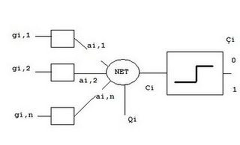 verilen girdilere dayalı çıktının hesaplanması (NET)<sub>i</sub>=Σ<sub>j=1</sub><sup>n</sup>a<sub>ij</sub>g<sub>ij</sub>+Q<sub>i</sub> şeklindedir.